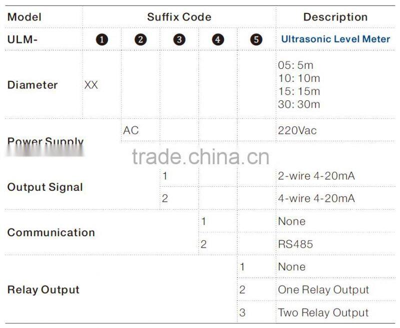 | Display | English language display, Level measurement, distance measurement, Transmission value, ambient temperature, echo state, alarm display, algorithm selection |