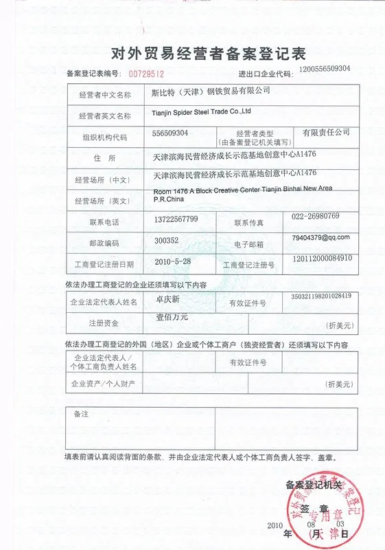 Year of 2010: we independent from our mother company as a subsidiary international trading company, we have the name of Tianjin Spider Steel Trade Co,,Ltd.