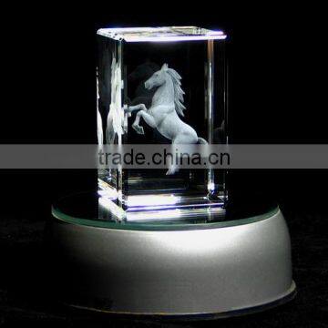New Design 3d Laser Engraving Horse Crystal Glass Cubes With LED Light Base for Gift Items