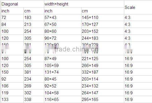 (Dimension 60 inch-400 inch, format 1:1, 4:3, 16:9, 16:10, 2:1).