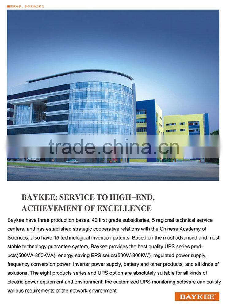Foshan Baykee New Energy Technology Incorporated Company was founded in 2007.about 500workers, and 30engineers, two product base, Baykee Mainly produce ups,inverter,solar system,battery for ups and solar system. BAYKEE UPS is widely used in home appliance, data processing center systems, computer server center systems, education, transport ,communication ,banks systems, securities systems, medical and other hi-tech systems.It has successfully served Wuhan-GuangZhou high railway, Beijing-Shanghai high railway, Guangzhou Asian Games, Shanghai World Expo, Guangzhou TV tower, Guangzhou Baiyun airport, Yuxiang high way, Yuezhang high way, Guiguang high way and many other large projects of China. Products are also exported to many countries.