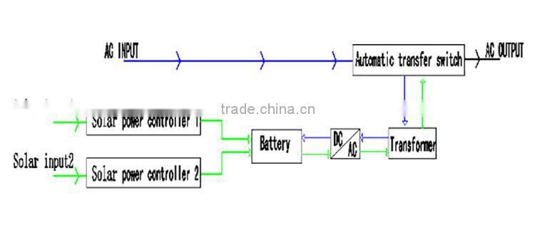 Working principle of solar inverter: when the solar energy is abundant,it provide the inverter through the the MPPT controller and charge the battery at the same time. Then the inverter converts the DC input power to pure sine wave AC output power.