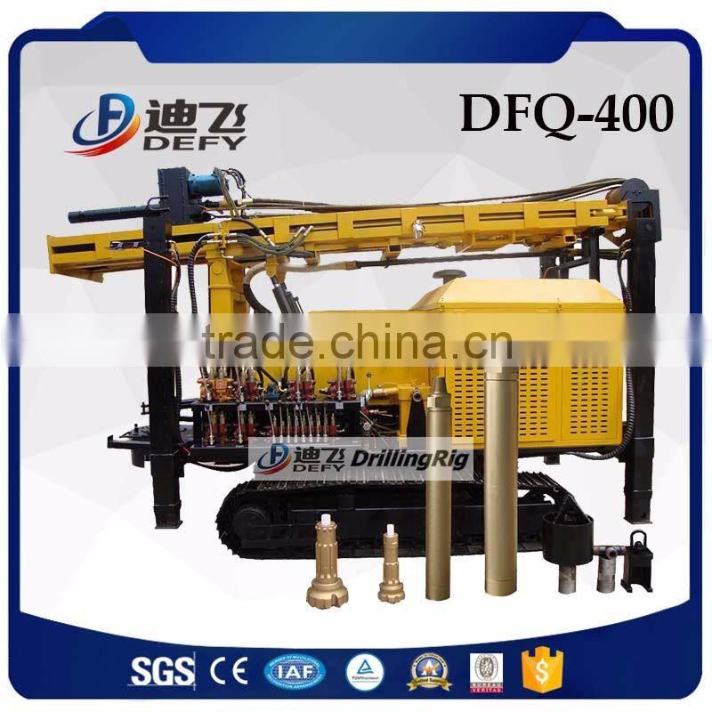 DFQ-400 Hydraulic borehole testing ground drill equipment adopts air compressor feeding, equipped with DTH hammer tools, very efficient for drilling rocky mountains and hard rocks. It only takes 3~5 minutes to drill one meter hard rocks.
