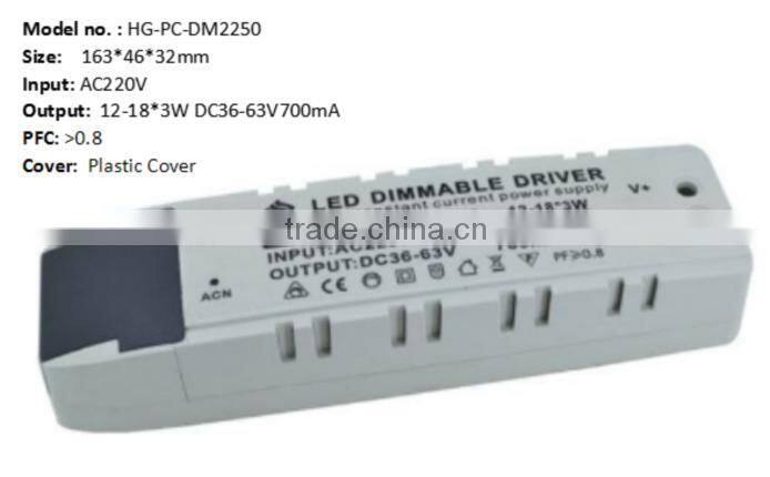 | HG-PC-DM2250 | 163*46*32 | 12-18*3W | AC220V | DC36-63V | 700mA | >0.8 | $7.81 |