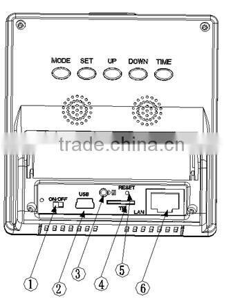 1. power switch 2.USBcharge 3.Play on/off 4.TFslot 5.RESET(Restore factory setting) 6.LAN