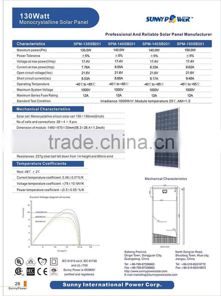 135w Solar Panel With IEC Certificate
