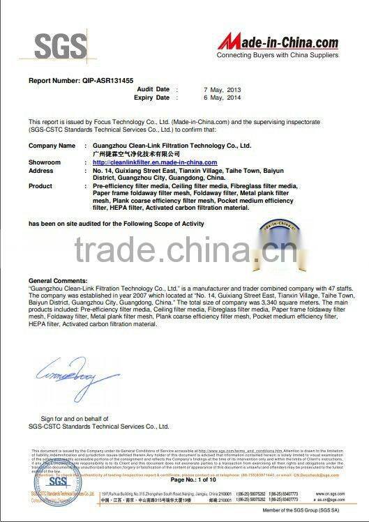 The filtration material is made of fibreglass filter paper which is waterproof and flame retardant. or the PP high efficiency filter paper