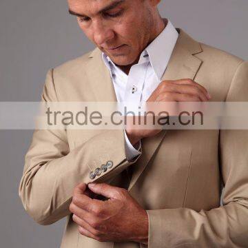 | Style | single breast and two-button, double vent, hand stitching, imitation lapel button hole, nortch lapel and straight pocket with flap. |