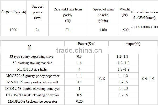 Unprocessed food grains are poured into the feed hopper and elevated by single elevating conveyor to cleaning sieve,big and small foreign matters of unprocessed food grains will be cleaned up; cleaned grain will be elevated by double elevating conveyor to Husker to shell;rice shell will be conveyed by the crude bran separator to the exterior of machine or collect by Cyclone; mixture of paddy and unpolished rice will be elevated by double elevating conveyor to gravity paddy separator to carry out the separation of grain and bran;separated material including: one is material which including more paddy, these material will return to husker through double elevating conveyor to shell again,the second one is mixture of paddy and brown rice, these material will return to paddy separator by double elevating conveyor, the last one is clean brown rice,hese material will into rice mill to whitening. The fine bran out of whitener will be collected by a fine bran cyclone, and the rice out of rice outlet mouth is the finished rice.