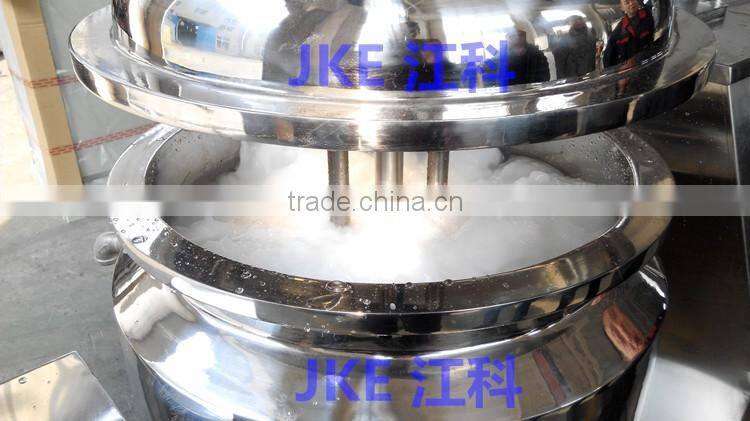The series of Vacuum Homogenizer are mainly used in all kinds of liquid- liquid phase, liquid-solid phase mixing, dispersion and emulsion processing. All kinds of slow agitator: paddle-type, spiral type and frame type(also with scraper), can be installed in the stainless steel tank body to achieve the overall mixing. In addition, high-speed emulsifier in the tank: scattered disc type, the upper suction shearing type, the lower suction shearing type, the upper and lower suction type, and emulsifier installed at the bottom of tank body etc., can meet different requirements of materials with various physical properties and achieve superfine dispersion and emulsification. The machine adopting sanitary stainless steel material, with good internal and external polish surface, manufactured meticulously, can maximize the the stability of equipments on the basis of mixing emulsification effects. Tanks can be heated or cooled, with Miller sandwich plate, having advantages of large exchange area and high efficiency of exchanging heat.