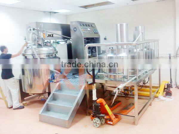 The series of VEM vacuum emulsifying mixer are mainly used in all kinds of liquid- liquid phase, liquid-solid phase mixing, dispersion and emulsion processing. All kinds of slow agitator: paddle-type, spiral type and frame type(also with scraper), can be installed in the stainless steel tank body to achieve the overall mixing. In addition, high-speed emulsifier in the tank: scattered disc type, the upper suction shearing type, the lower suction shearing type, the upper and lower suction type, and emulsifier installed at the bottom of tank body etc., can meet different requirements of materials with various physical properties and achieve superfine dispersion and emulsification. The machine adopting sanitary stainless steel material, with good internal and external polish surface, manufactured meticulously, can maximize the the stability of equipments on the basis of mixing emulsification effects. Tanks can be heated or cooled, with Miller sandwich plate, having advantages of large exchange area and high efficiency of exchanging heat.