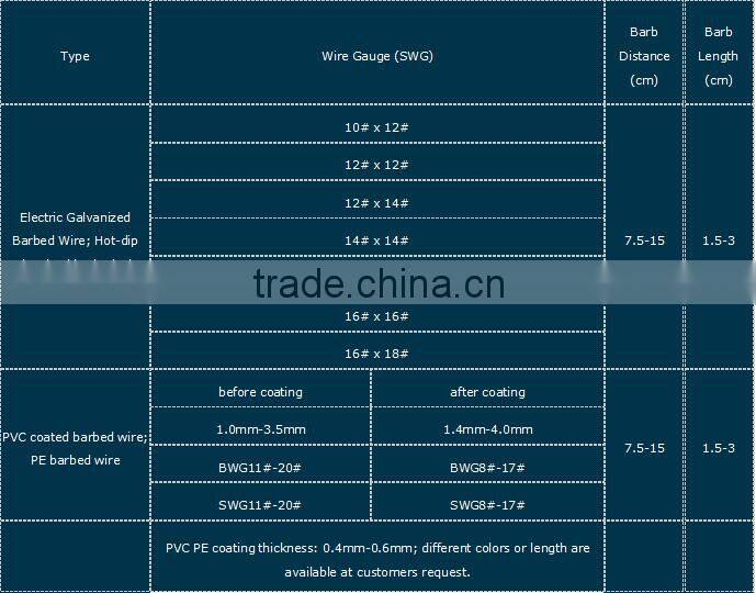 Barbed Wire Material: high quality low carbon steel wire (galvanized, hot galvanized, coated, spray) silk, blue, green, yellow and other colors.