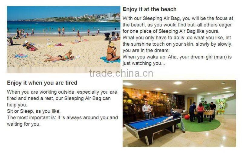 That is why our Sleeping Bag is getting more and more popular, small(without air), easy to bring; big(with air), just sleep with it on the beach, start to enjoy your life...