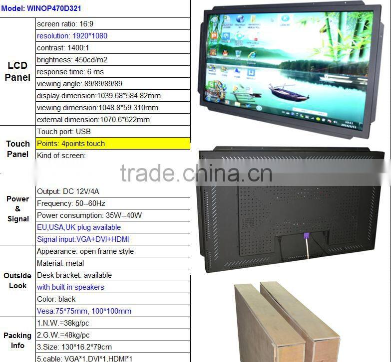 Wintouch 47" touch screen monitor /open frame monitor / open frame touch monitor for outdoor use
