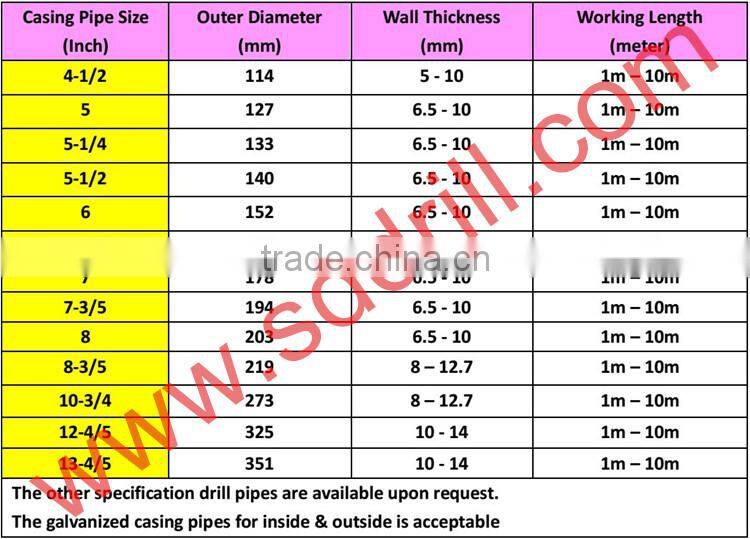 Galvanized Casing pipes have very good rust protection and will be have longer use life than the common type casing pipes. They are used in coring, water well, geological, geothermal, construction, DTH drilling project, to keep the hole diameter and compare the coring & DTH equipment drilling, It connect with casing bits and casing shoe directly.