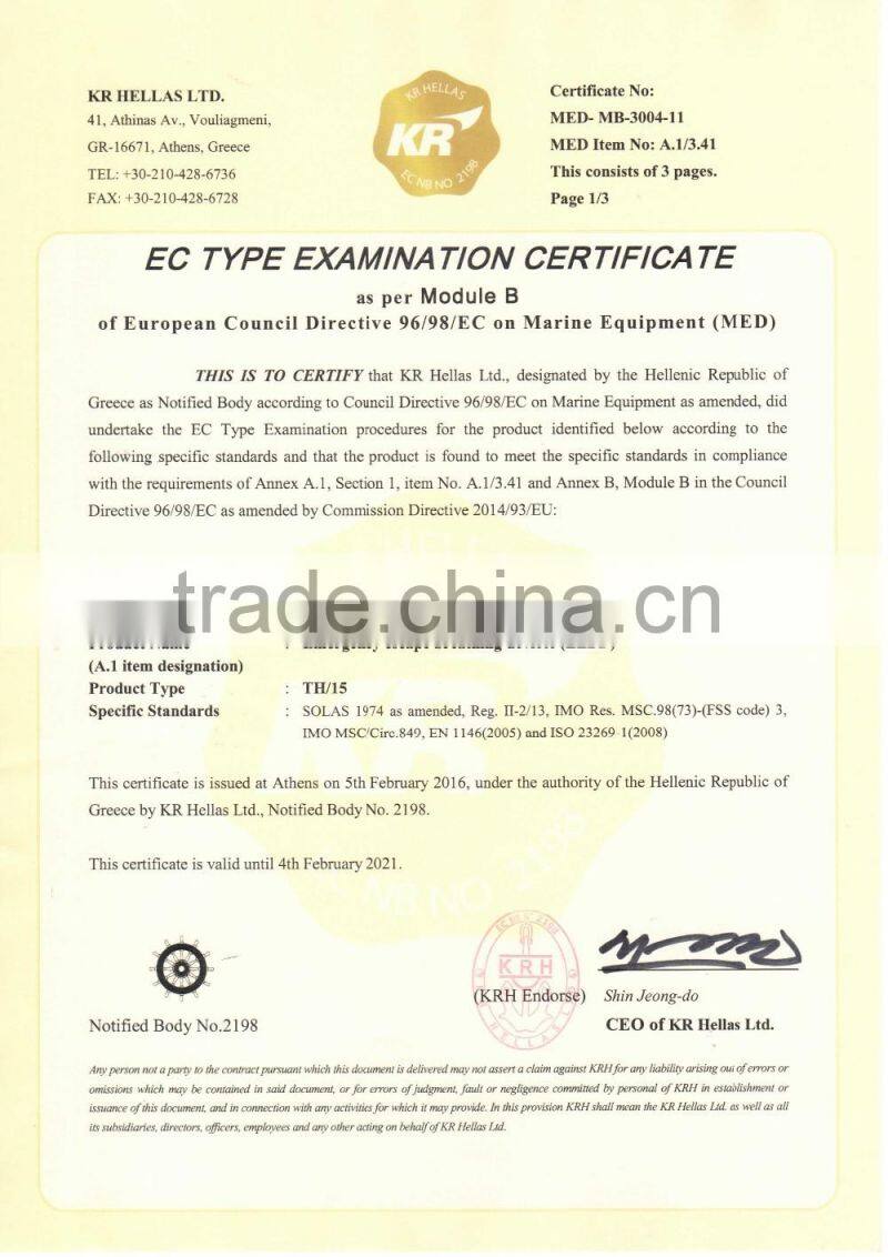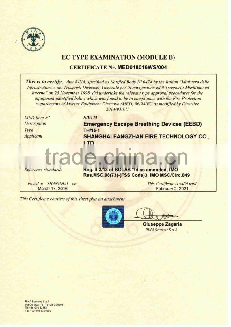 Required by SOLAS 1974 in regulation 13 revised in 2000,all ship shall carry at least two Emergency Escape Breathing Devices (E.E.B.D.)within accommodation spaces for providing respiratory protection in toxic and oxygen deficient atmospheres. On all ships, within the machiner spaces, E.E.B.D.shall be situated ready for use at esaily visible places,which can be reached quickly and easily at any time the event of fire . The location of E.E.B.D shall take into account the alyout of the machinery space and the number of presons normally working in the SPACES .The E.E.B.D. should have at least a duration of seveice of 10 mins and should inculde a hood or full face piece to protect the eyes, nose and mouth during escape, complying with the Fire Safety Systems (F.S.S) Code.Hoods and face pieces should be considered flame resistant and include a clear window for viewing. An unactivated E.E.B.D should be capable of being carried hands-free.