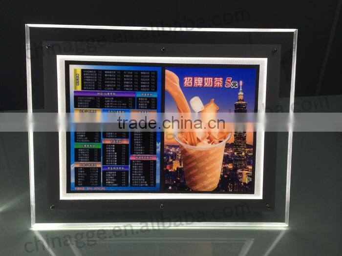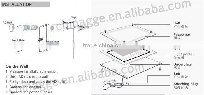 * Adopt solid Plexglass penel, top-grade eco-friendly laser engraved dots LGP( light guide panel) and high-brightness LED energy-saving light source; uniform light, high brightness and perfect effect for advertising display.( Brightness value: 1000 lumen-5000 Lumen)