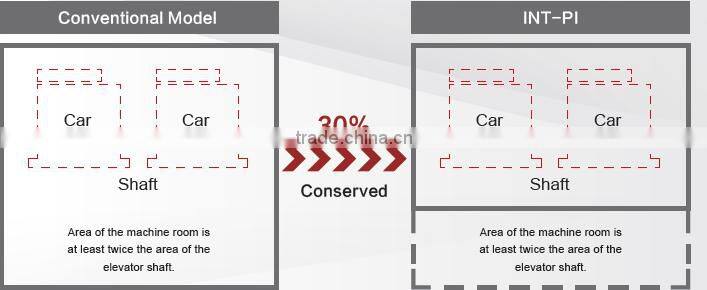 The INT-PI passenger elevator requires a smaller machine room size through the use of slimmer traction machine, control panel and machine room equipment. This allows flexibility in building design through maximizing the usage of building space.