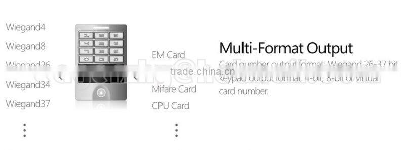 Key-W is our new genneration RFID & PIN metal access control, it's designed with very new fashion style. It's a hit since issued the market! It allows entry via PIN/ and/or by presenting a proximity EM, IC, or CPU card. It's aluminum alloy structure, waterproof, fully potted, confirmed to IP66, Keypad panel, digital backlit key, the back light can be set to Normal ON, Normal OFF or Automatic mode, very hot in market!