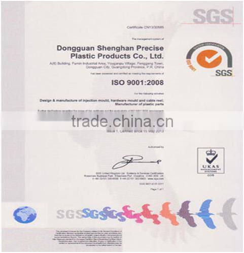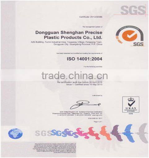 Most mold plastic mold we manufacture between 30 kg and 3 tons, the main supplier for the Lung Kee, Futaba; mold parts using DME, HASCO, MISUMI international standards. We are familiar with all kinds of plastic material properties, such as: PP, PC + ABS, LCP, NYLON, POM, ABS, PBT, PET, PC, PPS, TPE, TPR, and so on. Our import and export right, the products are mainly exported to: North America and Europe. The company passed ISO9001: 2008 international standard quality management system certification and ISO14001: 2004 international standard environmental management system certification.