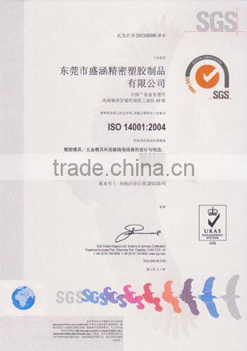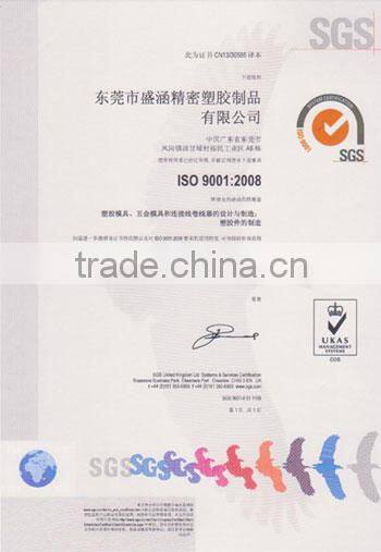 Most mold plastic mold we manufacture between 30 kg and 3 tons, the main supplier for the Lung Kee, Futaba; mold parts using DME, HASCO, MISUMI international standards. We are familiar with all kinds of plastic material properties, such as: PP, PC + ABS, LCP, NYLON, POM, ABS, PBT, PET, PC, PPS, TPE, TPR, and so on. Our import and export right, the products are mainly exported to: North America and Europe. The company passed ISO9001: 2008 international standard quality management system certification and ISO14001: 2004 international standard environmental management system certification.