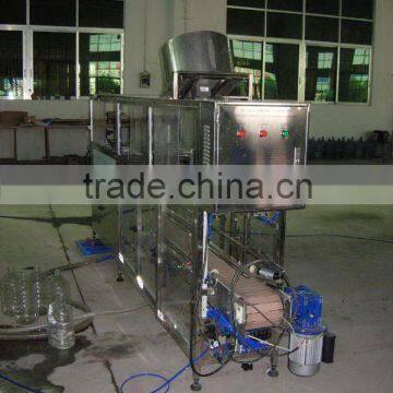 When bottles are sent to the machine by conveyor continuously, they firstly are deliveried to the receiving wheel by air-slide conveyor and then to washing part. The bottle clamps hold the bottles and trun over 180°to wash, then return back to their original position after enough washing and drying. Then, the bottles are sent to the middle thumb wheel 1 and to the filling part to be filled, then moved by middle thumb wheel 2 and reach to capping part to be capped, at the same time, cap trimmer sends caps to the top of the bottles and capper screws caps. At last, bottles are sent to the conveyor chain by the out stirring wheel to next working position.