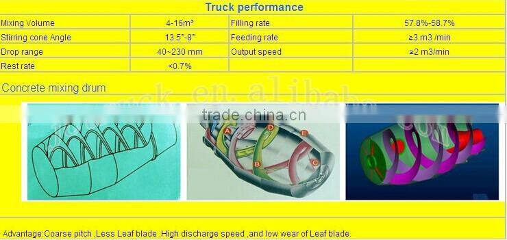 | Modified Description | 1.The Mixing Volume is 12m³,apply the ZF reduction gears, German Rexroth, motor. 2.The front head uses 8mm anti-wearing alloy material,the Stirred tanks and Leaf blade made by 6mm anti-wearing alloy material,with Air-Pressure Operated Water Supply Equipment. | |||