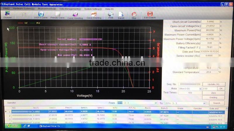 IV curve, PV curve, short-circuit current Isc, open circuit voltage Voc, the peak power Pm, the maximum power point voltage Vm, the maximum power point current Im, the fill factor FF, the cell efficiency η, the test temperature T. Can also be displayed by the mouse at any point on the curve corresponding to the current, voltage and power parameters.