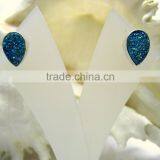 Coated Titanium Druzy Pear Natural Gemstone Earrings, 925 Sterling Silver Earrings, Designer Blue Stud Earrings
