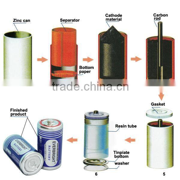 6 | Fitting tinplate bottom and metal jacket | The tinplate bottom and washer are placed on the bottom of zinc can and covered by metal jacket |
