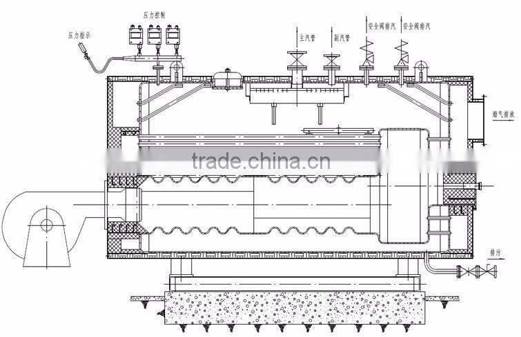 4, Horizontal steam boiler shell type three return all wet back downstream fireworks tube structure, the flame in the combustion chamber large combustion slightly positive pressure, fully extended, combustion heat load is low, the high heat of combustion efficiency, effectively reducing the exhaust gas temperature , energy saving and economical. Waveform furnace and threaded pipe structure that improves the strength of the boiler heat, but also meets the needs of thermal expansion of the heat transfer surface, scientific and rational, durable.