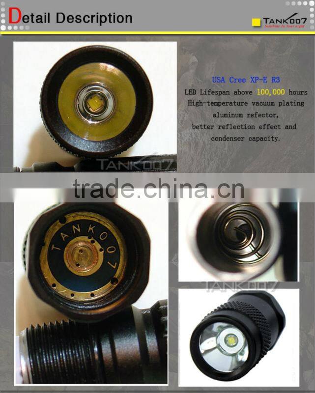 Oriented by development and creation, TANK007 pays attention to product originality.TANK007 has established cooperative relationship with world's top material supplier (for example, all TANK007 flashlights adopt the most famous led like CREE from the USA, Osram from Germany, UV chip from Japan, etc). All the key parts of flashlights are self-developed and processed in order to ensure stable performance and competitive cost, for which TANK007 flashlights has enjoyed good reputation in flashlight industry.