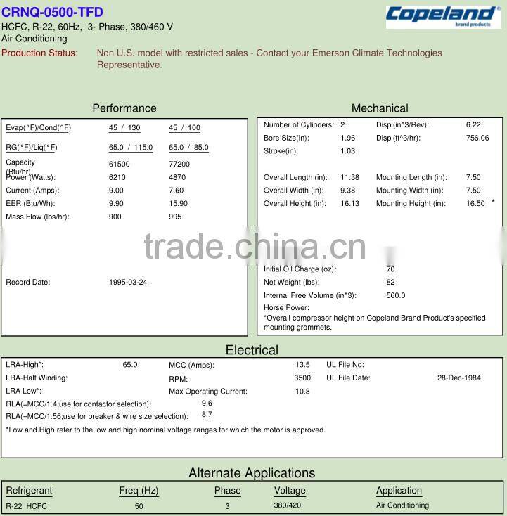 Specification Copeland hermetic compressor CRNQ-0500-TFD Capacity(Btu/hr) 61500 Power(W) 6210 Horse power 5 Mass flow(Lbs/hr) 900 EER(Btu/Wh) 9.90 Weight (Lbs) 82 Approval CE,UL