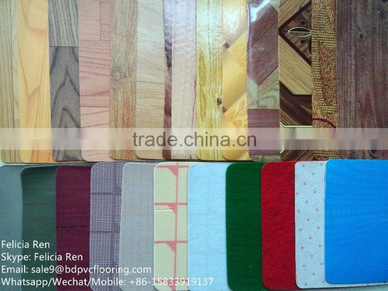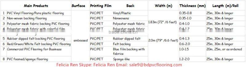 3. Our main products are pure/solid PVC flooring, Sponge/Foam PVC flooring, Mesh fabric backing PVC flooring, Felt backing PVC flooring, Commercial PVC flooring for business use, Rubber dipped felt backing PVC flooring, Nylon fabric backing PVC flooring and Hot rolling non woven backing PVC flooring.