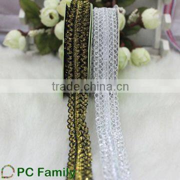 PC Family's 5/8 Hot sale gold silver metallic elastic ribbon is made of Spandex / Nylon fabric,it has bright colour,fine texture with high fastness to wet and dry rubbing.With colour fastness upto 4 level,it is washable and wearable.Widely used in variety of garments decoration, underwear accessories ,garment accessories and wedding decoration.