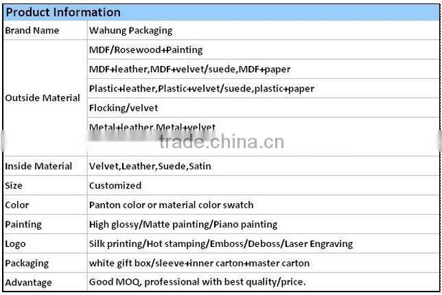 Shenzhen Wahung packaging manufacturing Co,Ltd is a leading company specialized in manufacturing wooden boxes & cases, pop displays, PU boxes and paper products for jewelry, watch, cosmetic, gift box eye-glasses, tea, cigar and wine etc. Our factory was found in 2005, relying on professional technologies, satisfactory services, innovative concept and practical attitude, our products command a ready market in Europe, USA, Japan & Middle East etc.