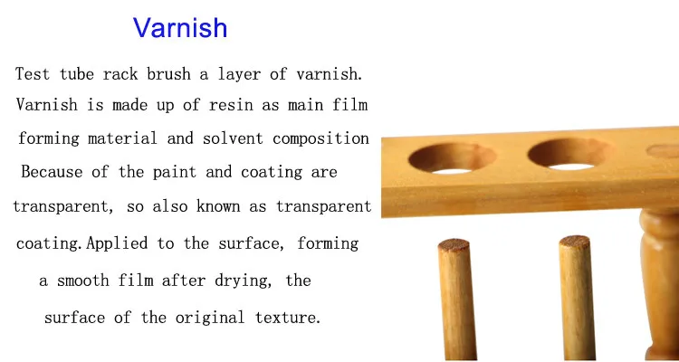 Test tube rack brush a layer of varnish.Varnish is made up of resin as main film forming material and solvent composition of coatings.Because of the paint and coating are transparent, so also known as transparent coating.Applied to the surface, forming a smooth film after drying, the surface of the original texture.