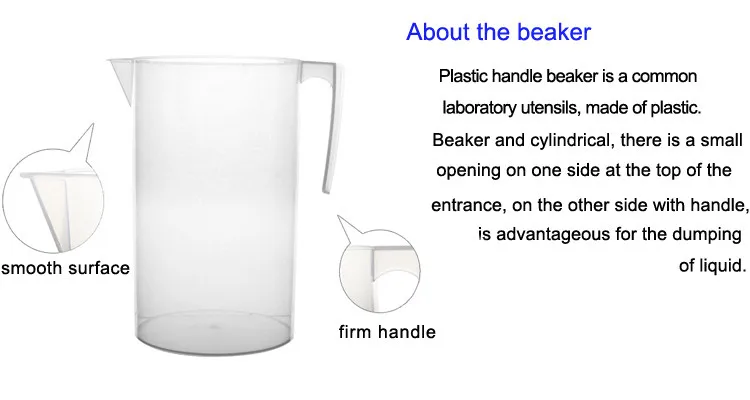 This company produces the beaker chemicals that can be used for the heating container, can be used as a tea set tablew,Plastic handle beaker is a common laboratory utensils, made of plastic.Beaker and cylindrical, there is a small opening on one side at the top of the entrance, on the other side with handle, is advantageous for the dumping of liquid.Some of the outer wall of the beaker with scale, can be roughly estimated volume of liquid in the beaker.