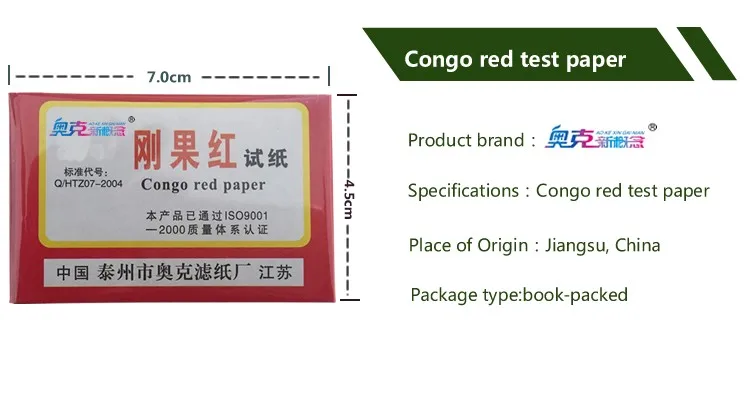 Congo red test paper is made from Congo red solution. Congo red dates red powder, can dissolve in water and alcohol, slightly soluble in acetone, almost insoluble in ethyl ether, acid was blue. Not only can it be used as a dye, but also as an indicator. Congo red is an acid indicator, the color change range is from 3.5 to 5.2, the base state is red, and the acid state is blue and purple. Some people think that Congo big red bayberries, is actually wrong. Congo red can be done as a pharmaceutical ingredient.