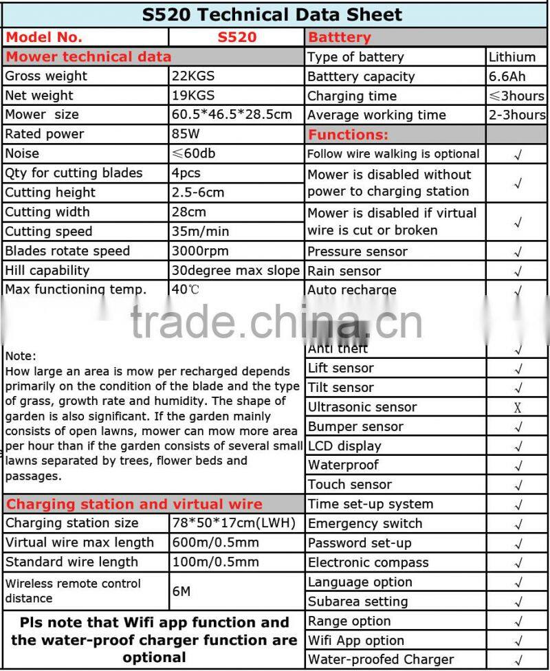 Newest !!! Robot lawn mower S520/Robot Grass Cutter is our 4th generation robot lawn mower and latest robot lawn mower came out in last month. More advance funtions like: pressure sensor, touch sensor,rain sensor, bump sensor, autorecharge, subarea setting, mowing schedule and so on.