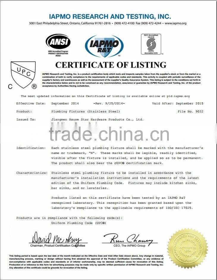 Now, 45 models of our Housestar Handmade Sinks are with CUPC Certificate. ( File NO.: 9032)