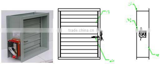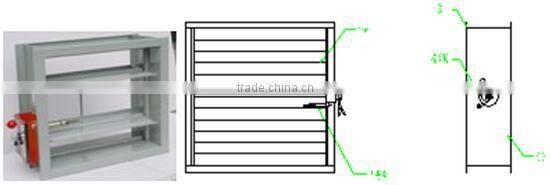 Usually it keeps closing, smoke (temperature) sensor outputs electric signal (DC24V) through control center when fire happens, actuator powers on, damper opens automatically, and output open signal. When smoke temperature reaches 280°C, damper recloses.