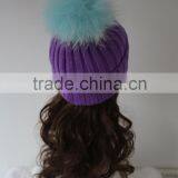 Purple Rib Knitted Hat With Top Baby Blue Raccoon Fur Ball Cute Fur Pompom Knit Beanie Cap