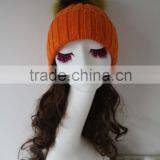 Favorite Style Orange Raccoon Fur Pompom Knitted Black Rib Cap Soft Touch Fur Ball Knit Wool Hat
