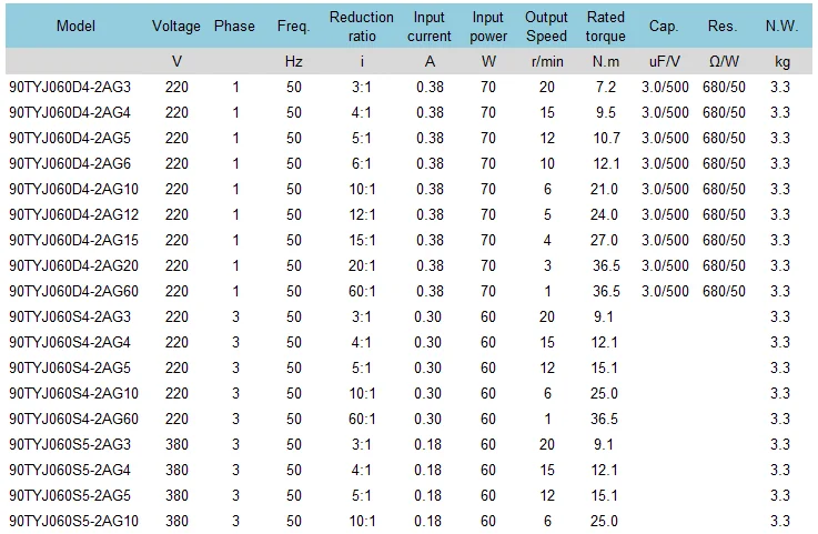 Note: The typical specifications below are just for your reference. Motors’ voltage ,frequency, speed , torque, shaft extension, outline dimension and insulation class can be customized. Please feel free to contact us if you can’t find the motor you required. We are always here being ready to help.