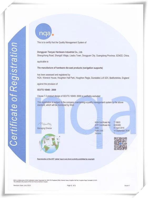 Tianyao Hardware was established in 2008, at Liaobu, Dongguan. We are a domestic type company which specilized in magnesium and aluminum die casting. We own from mould making, product producing, polishing, drilling, tapping, machining, CNC pricision machining, testing equipment... With the development of our company, we are dedicated to quality requirement, and we passed the ISO9001: 2008 and TS 16949.