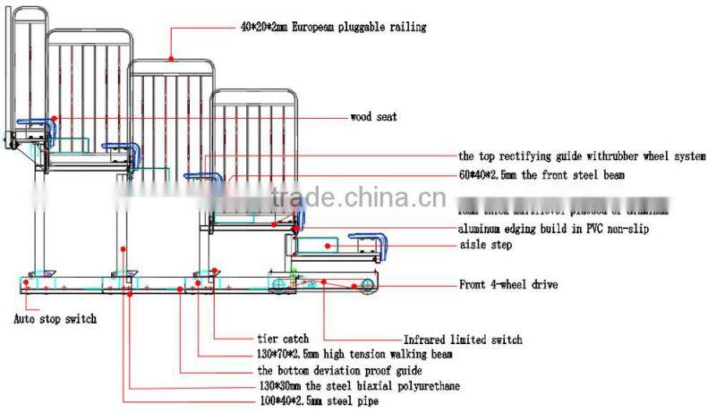 For the Infrared ray system to alarm and avoid the foreign matter during the bleacher on- off. Telescopic bleacher technology description for safety and structure.
