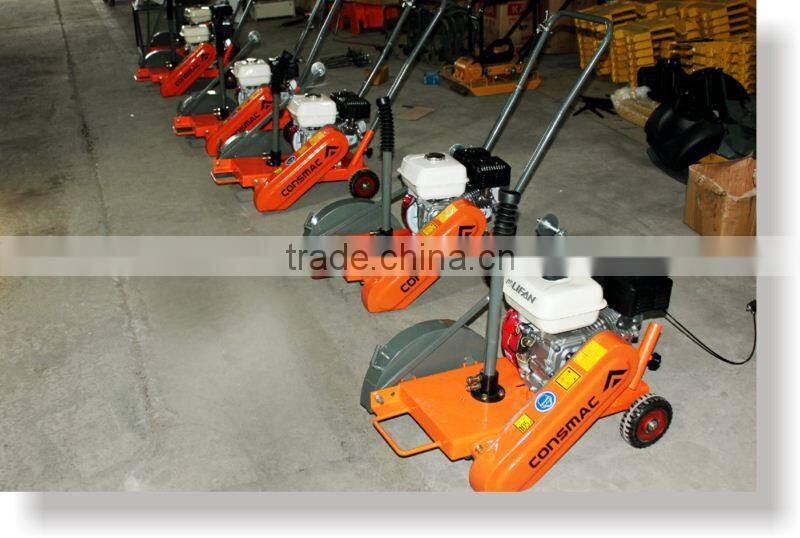 CONSMAC Concrete Cutter (often known as a Floor Saw or Concrete Saw is a power tool used for cutting concrete, masonry, brick, asphalt, tile, and other solid materials. It can be a small hand-held cut-off concrete cutter, a big walk-behind concrete saw or other styles, besides the gasoline,petrol engines, it can also be powered by diesel, hydraulic or pneumatic pressure, or electric motors. The saw blades used on concrete saws are often diamond saw blades to cut concrete, asphalt, stone, etc. Abrasive cut-off wheels can also be used on cut-off saws to cut stone and steel. The significant friction generated in cutting hard substances like concrete usually requires the blades to be cooled to prolong their life and reduce dust.