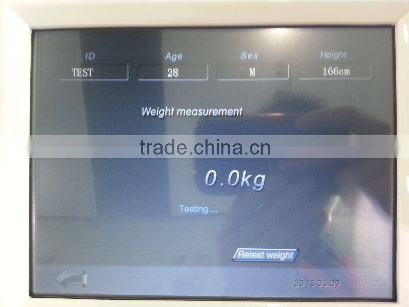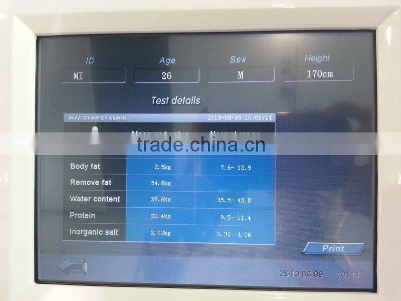 Human body elements analyse instrument can detect various elements of human body and analyse human health status, which applies the accurate measurement of AVR micro computer controller, bases on new statistics method DXA, analysis human elements: fat, weight,BMI, non-fat and other health indicators through multi-frequency bioelectrical impedance analysis scientific basis for losing weight effectively. Which is considered as an epoch-making results of the health industry. It is health for each test, thus develop new treatments analysis of health data to lose weight. Apply to hospitals, beauty clubs, sports and scientific research centers, institutions and enterprises, government agencies, sports clubs, health management and accessing agencies, it can help people evaluate their body state accurately. Because it has the functions of human body elements analyse, muscle and fat analyse, obesity analyse and healthy assessment.