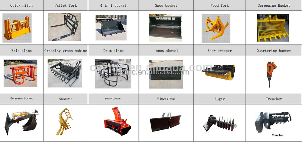 5.(quick change )option attachment: wooden fork, pipe, pallet fork, grass fork, rock bucket, bigger bucket, snow bucket, mixing bucket etc